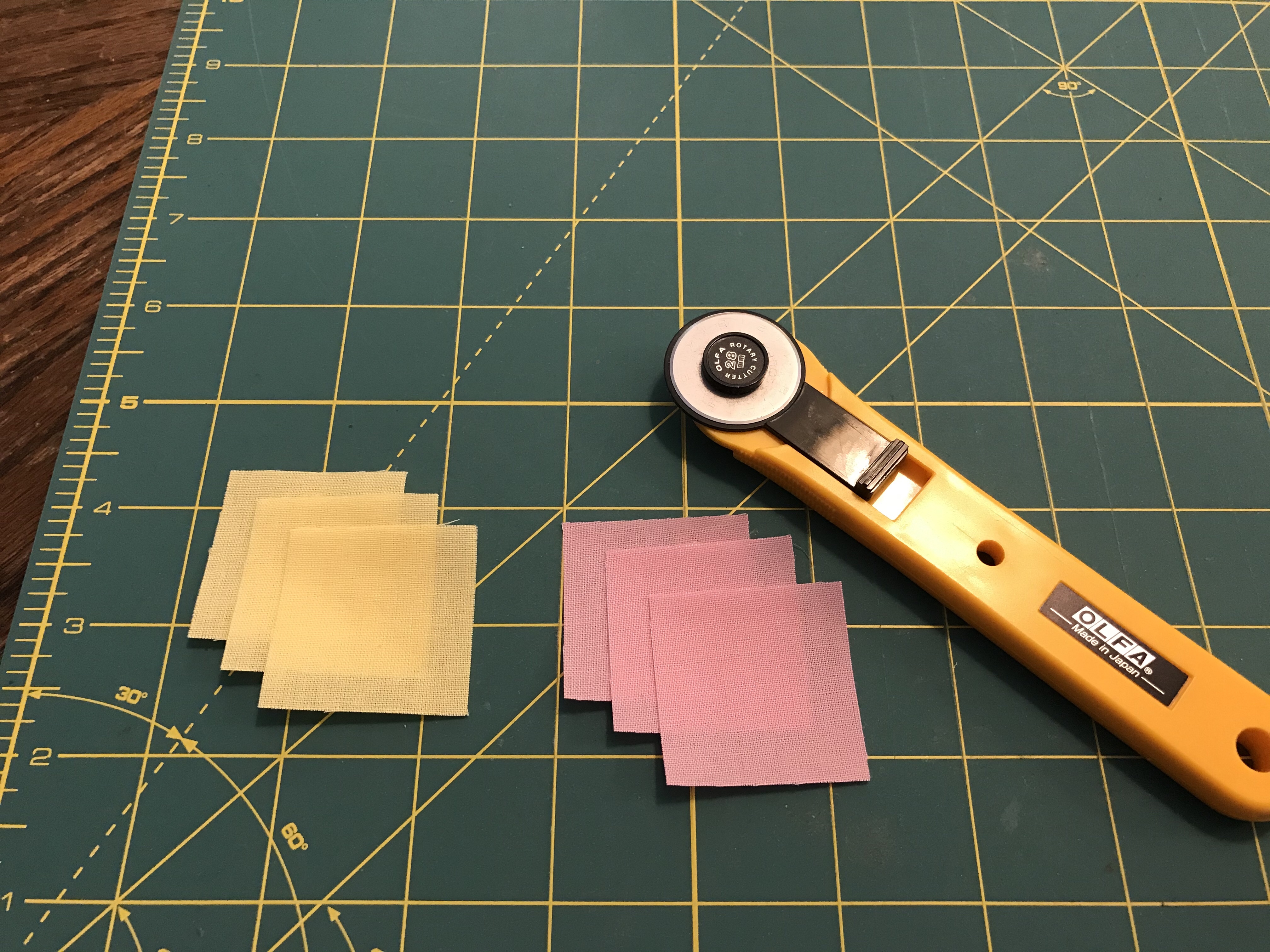It begins with a cloth square. The size of the square determines the size of the hair piece. Most squares are 0.75 to 1.5 inch size, but I recommend using 1.5 inch size squares when you are just beginning, since it is easier to practice the folding techniques with larger ones. I mentioned patience, but when you make your squares, precision is very important. In this way, it is a lot like origami. In order to get a perfect square, recommend to use a cutting mat with scale on and a rotary cutter.